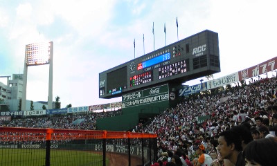 試合ですが、世間はうきうき夏休みで、しかも巨人戦ということで平日の割にはよく入っていました。外野も内野も市民球場にしては上出来なぎっしり二万人越え。阪神なんかと比べちゃあなんでもないですけどね。